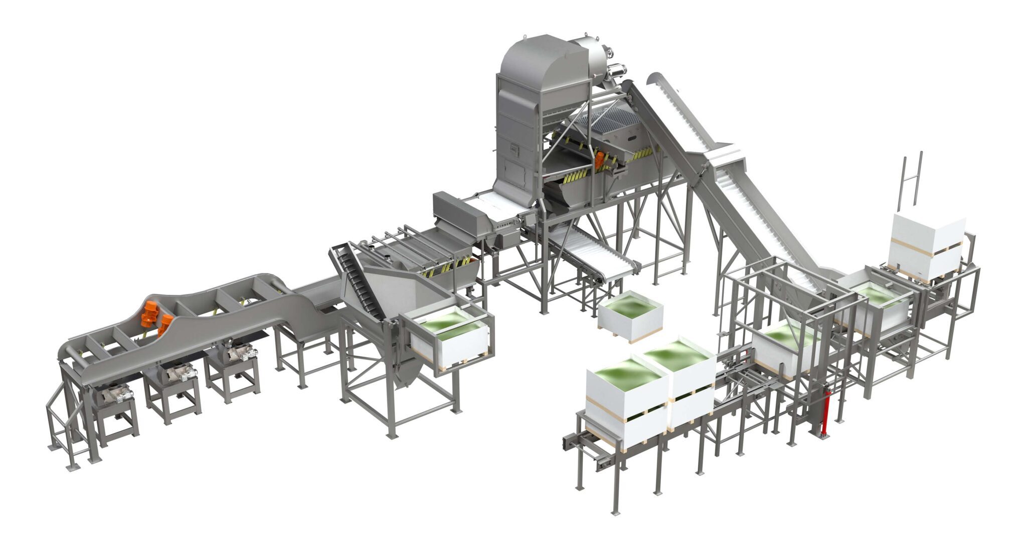 - Fully automated Bin de-stacking, Dumping, Re-stacking, and Metering systems